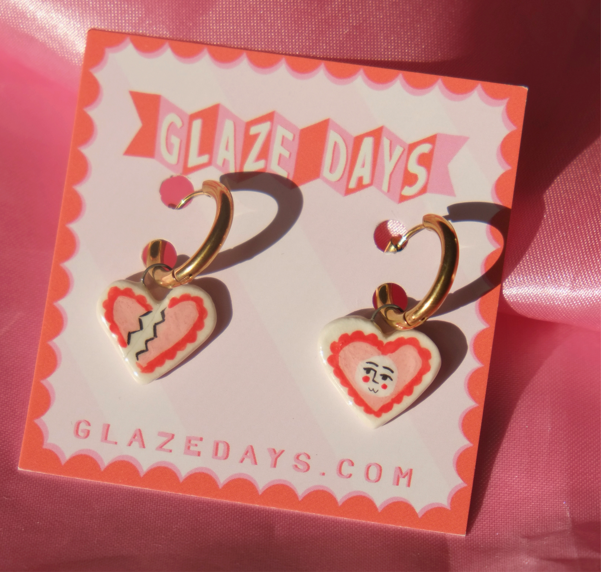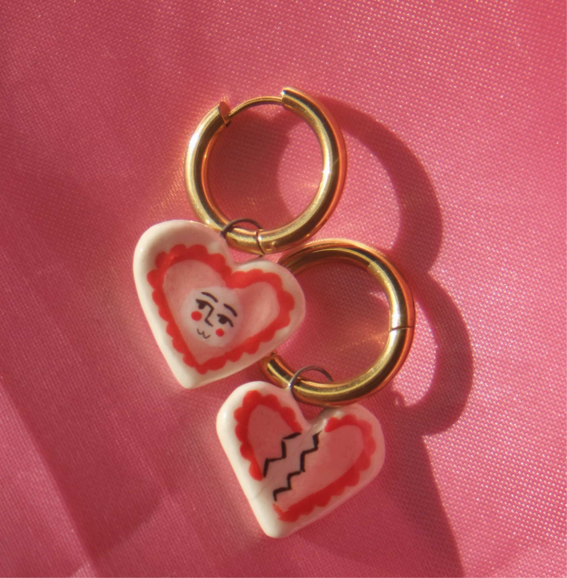 Gold-plated stainless steel hoops with handpainted porcelain charms. Nickel-free and hypoallergenic.