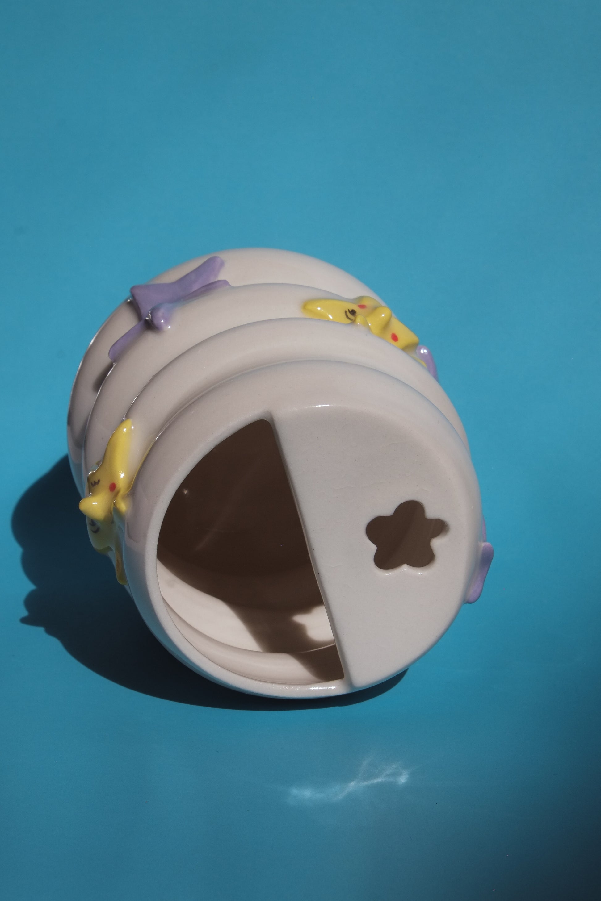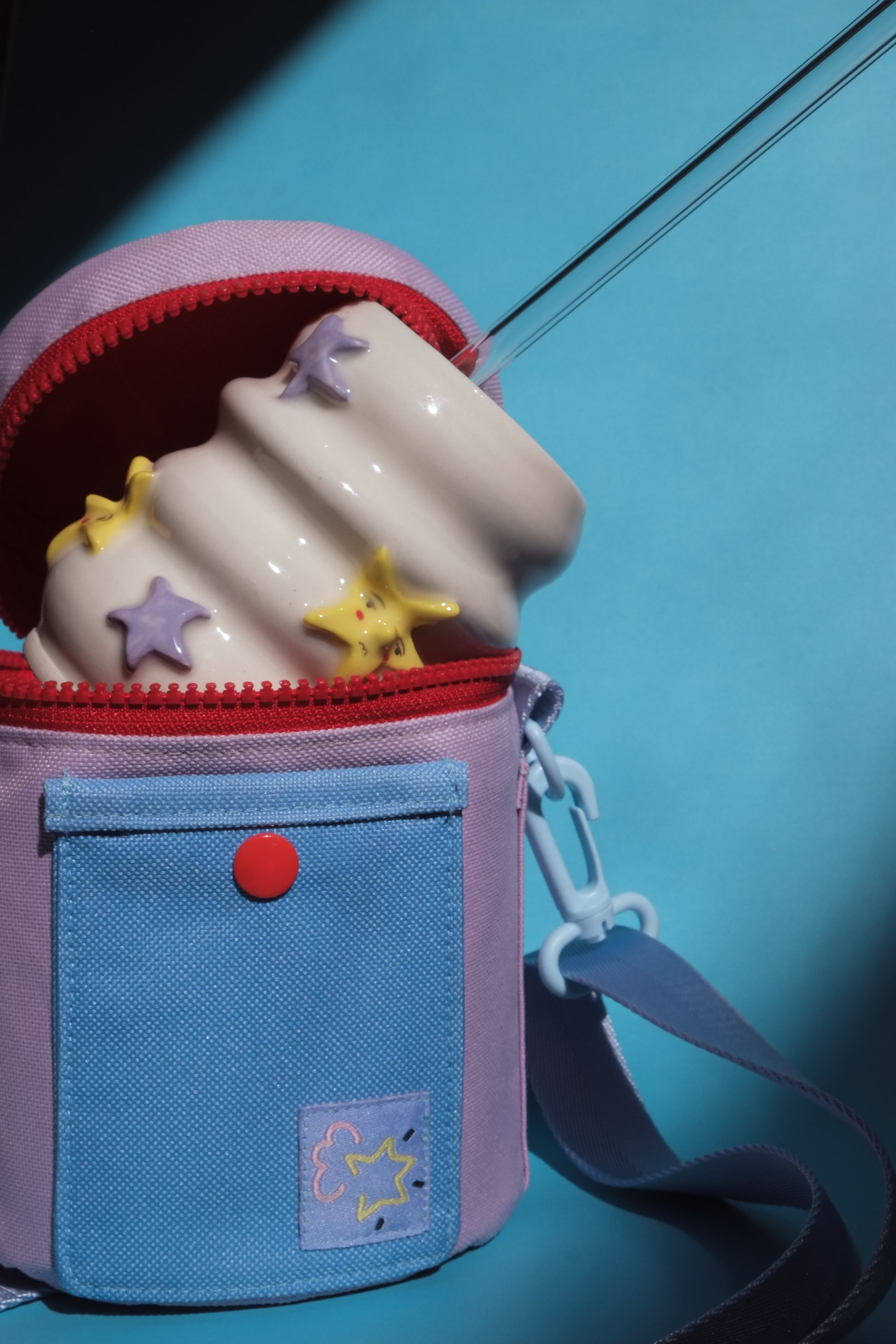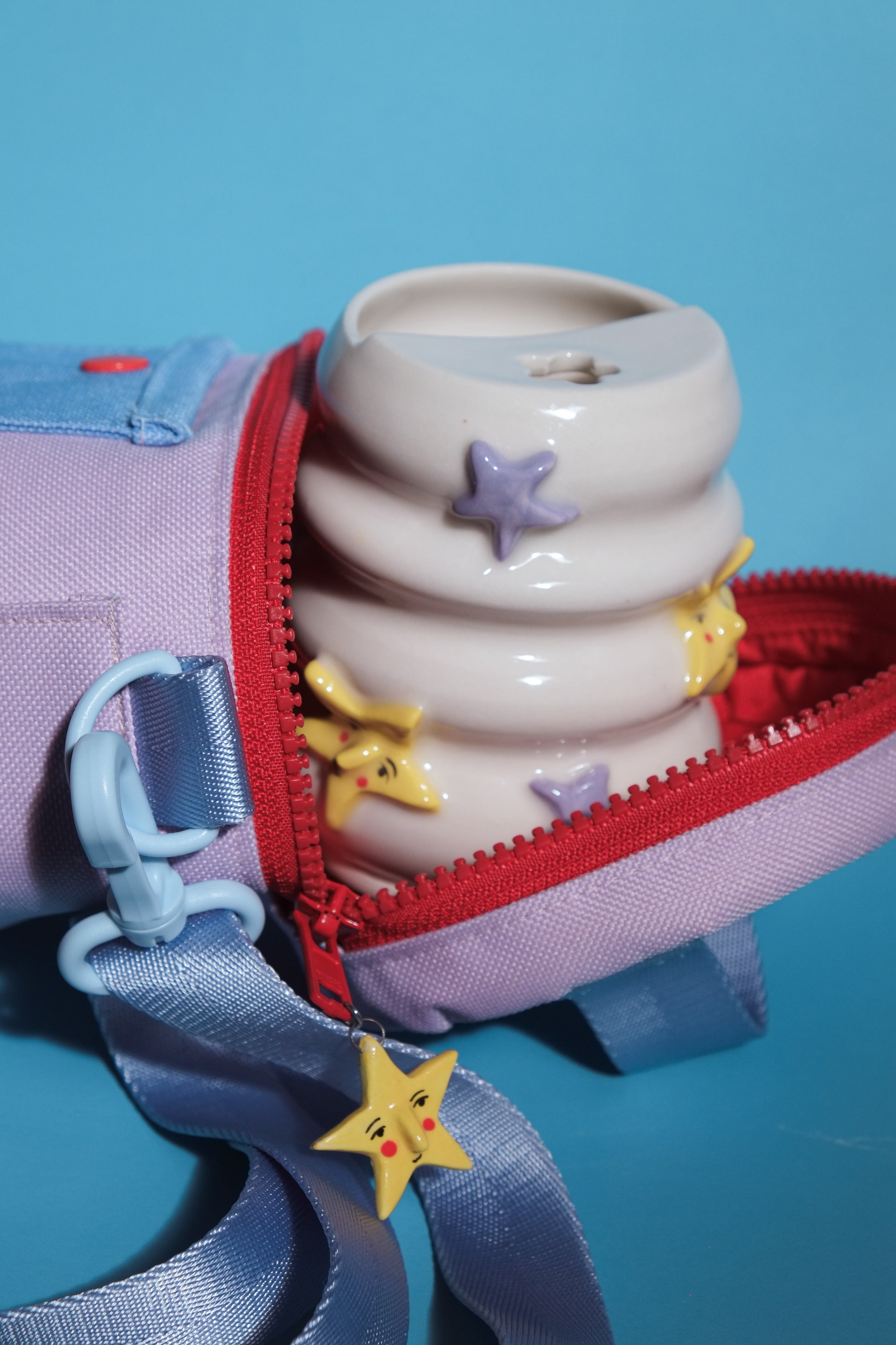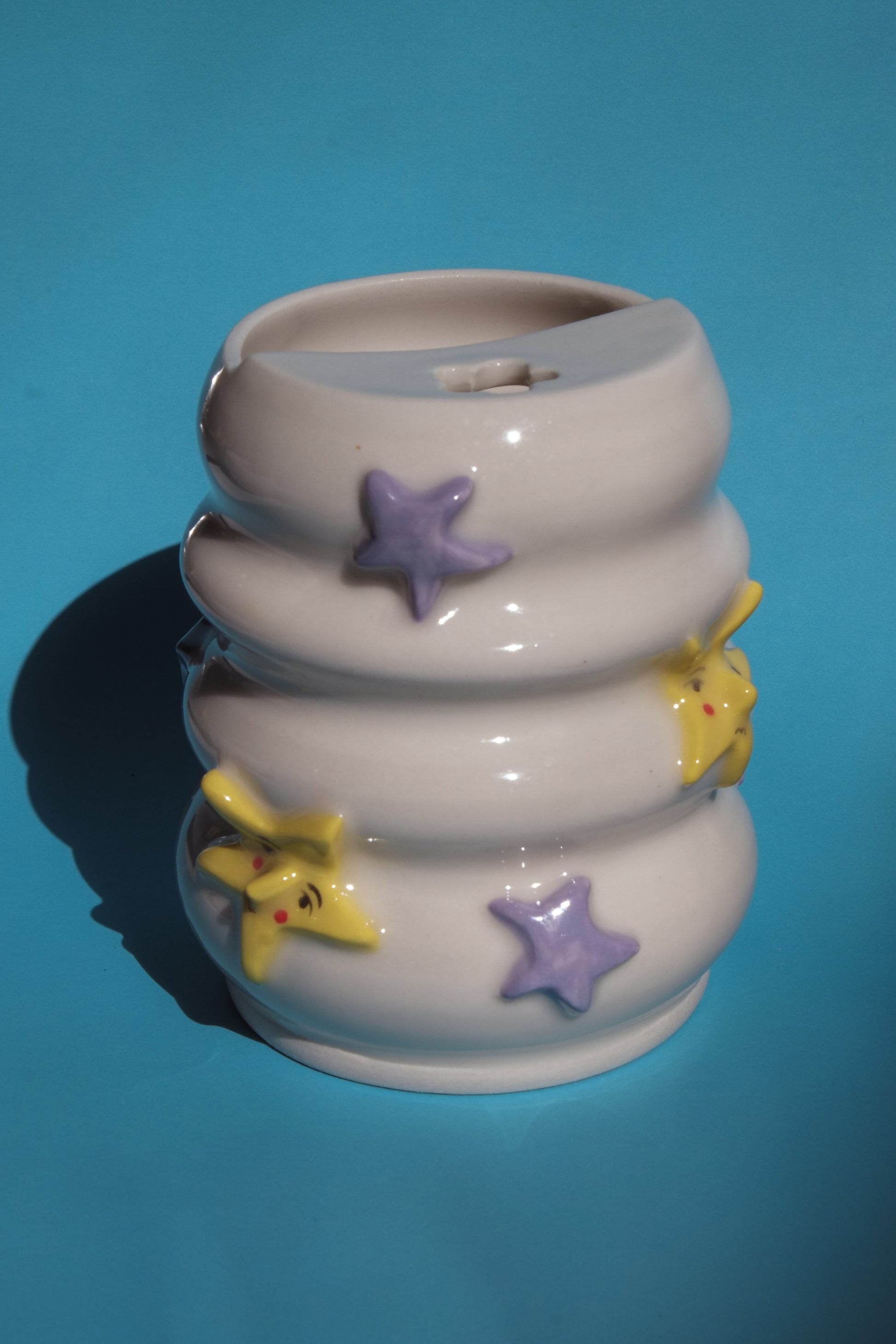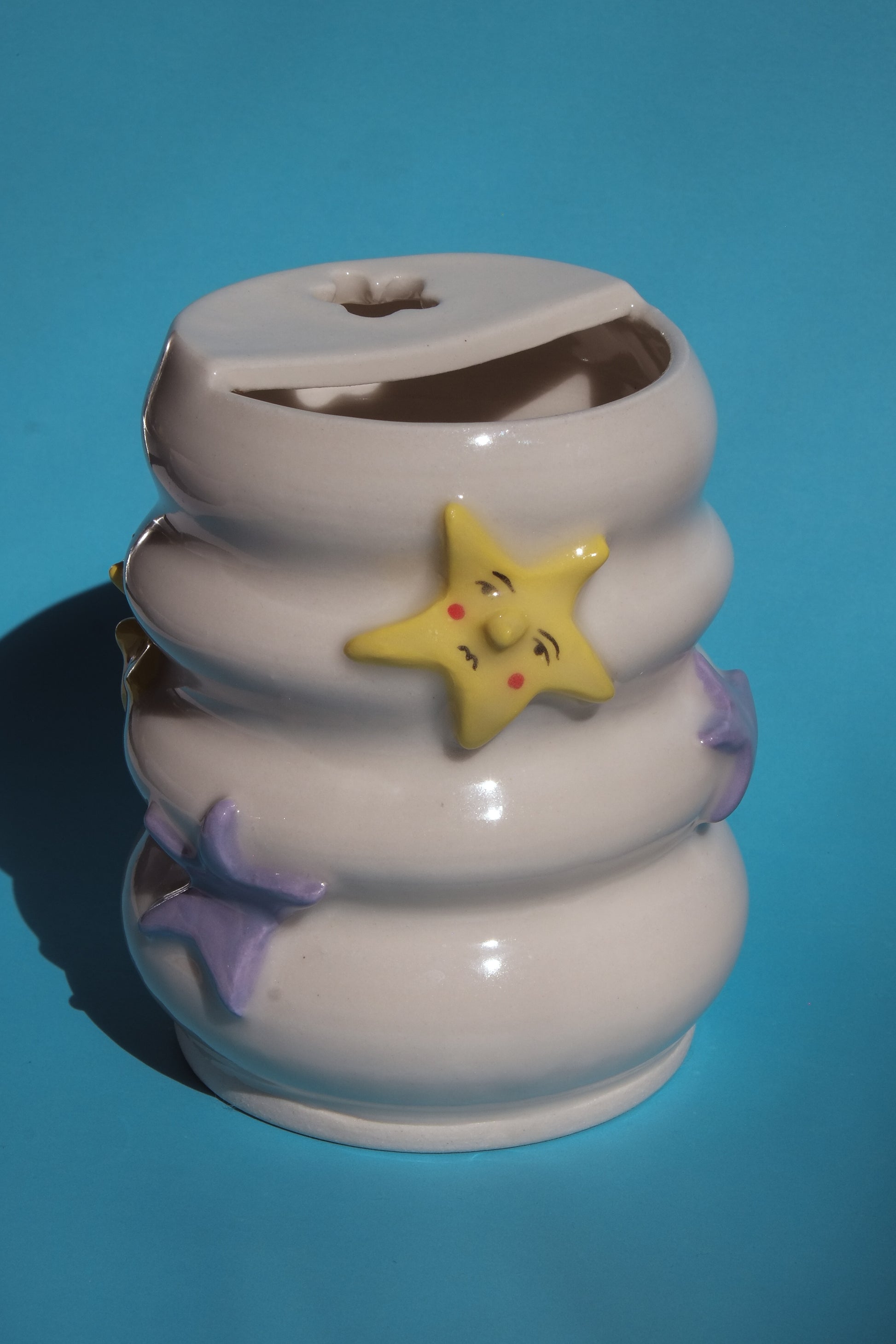 Wheel thrown porcelain travel cup with hand sculpted stars and moons with painted faces. Comes with a glass straw that fits perfectly with the cup!