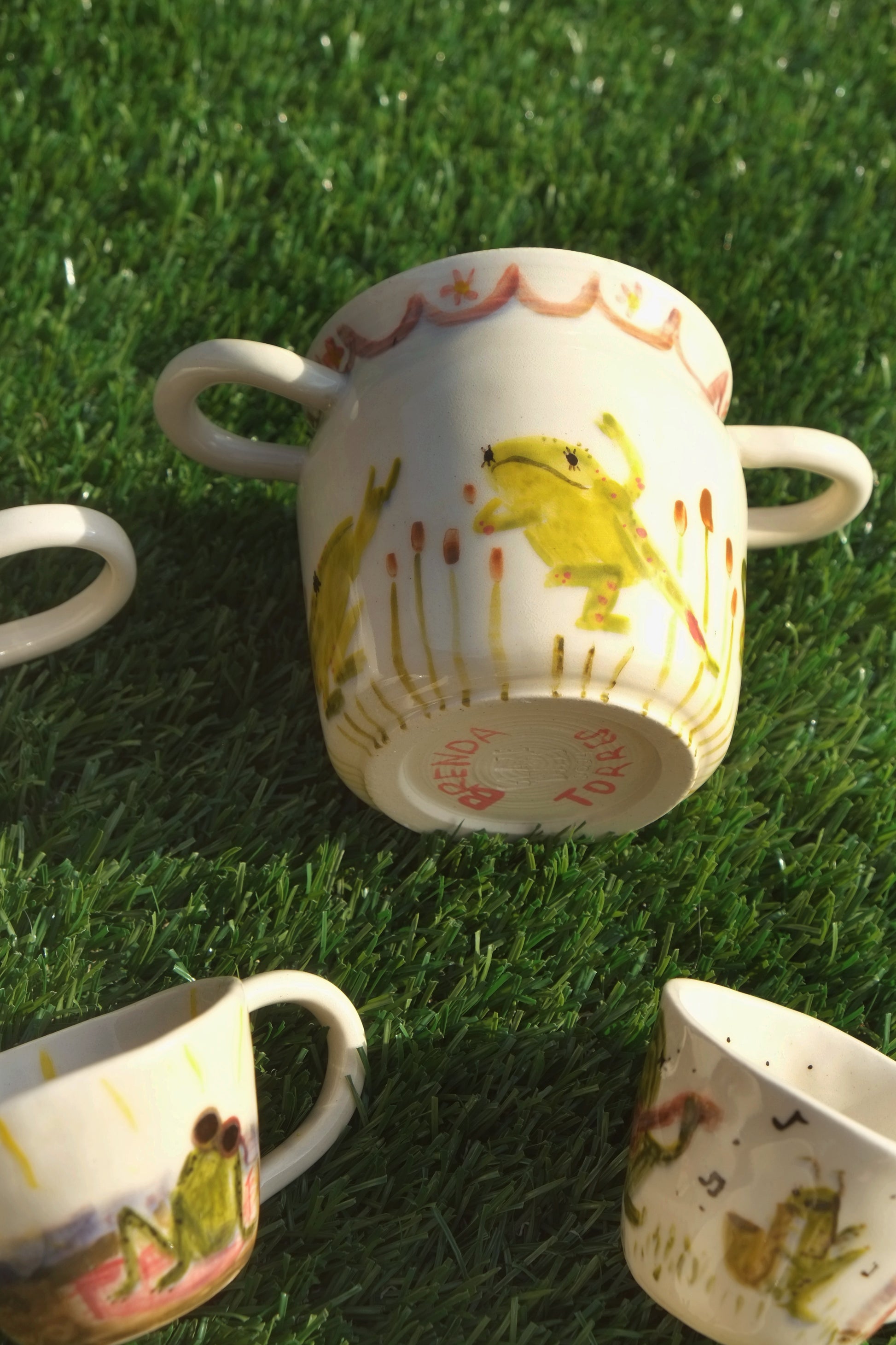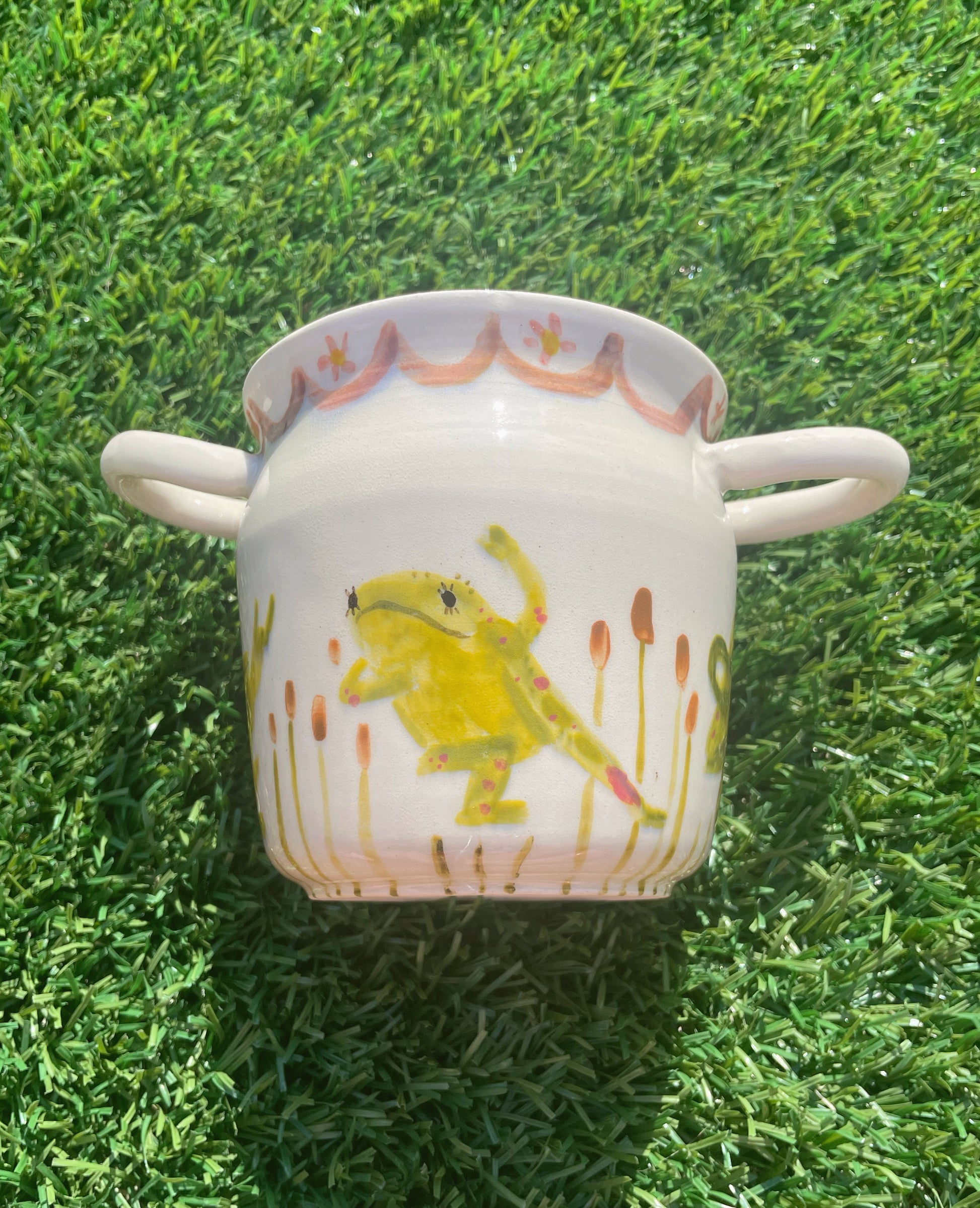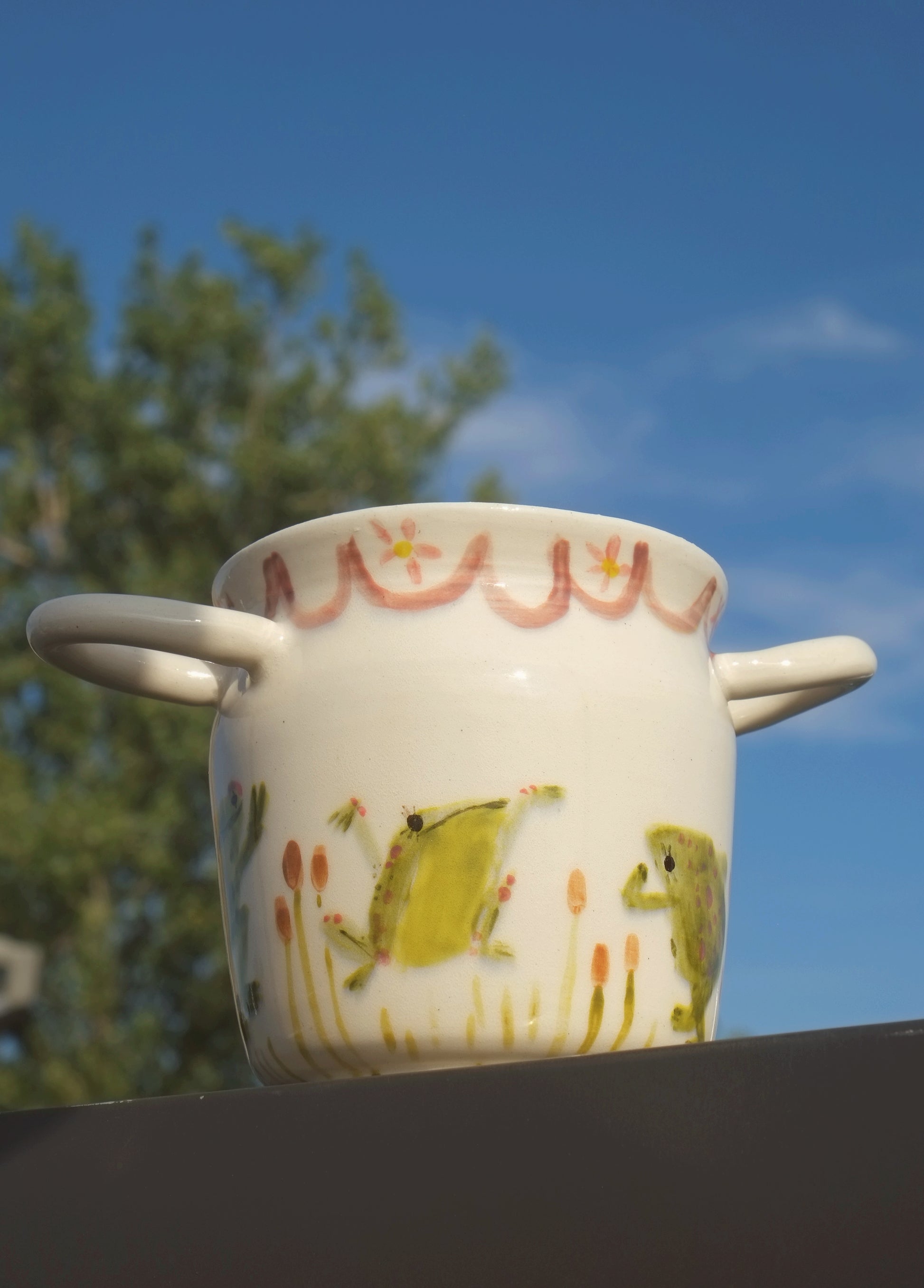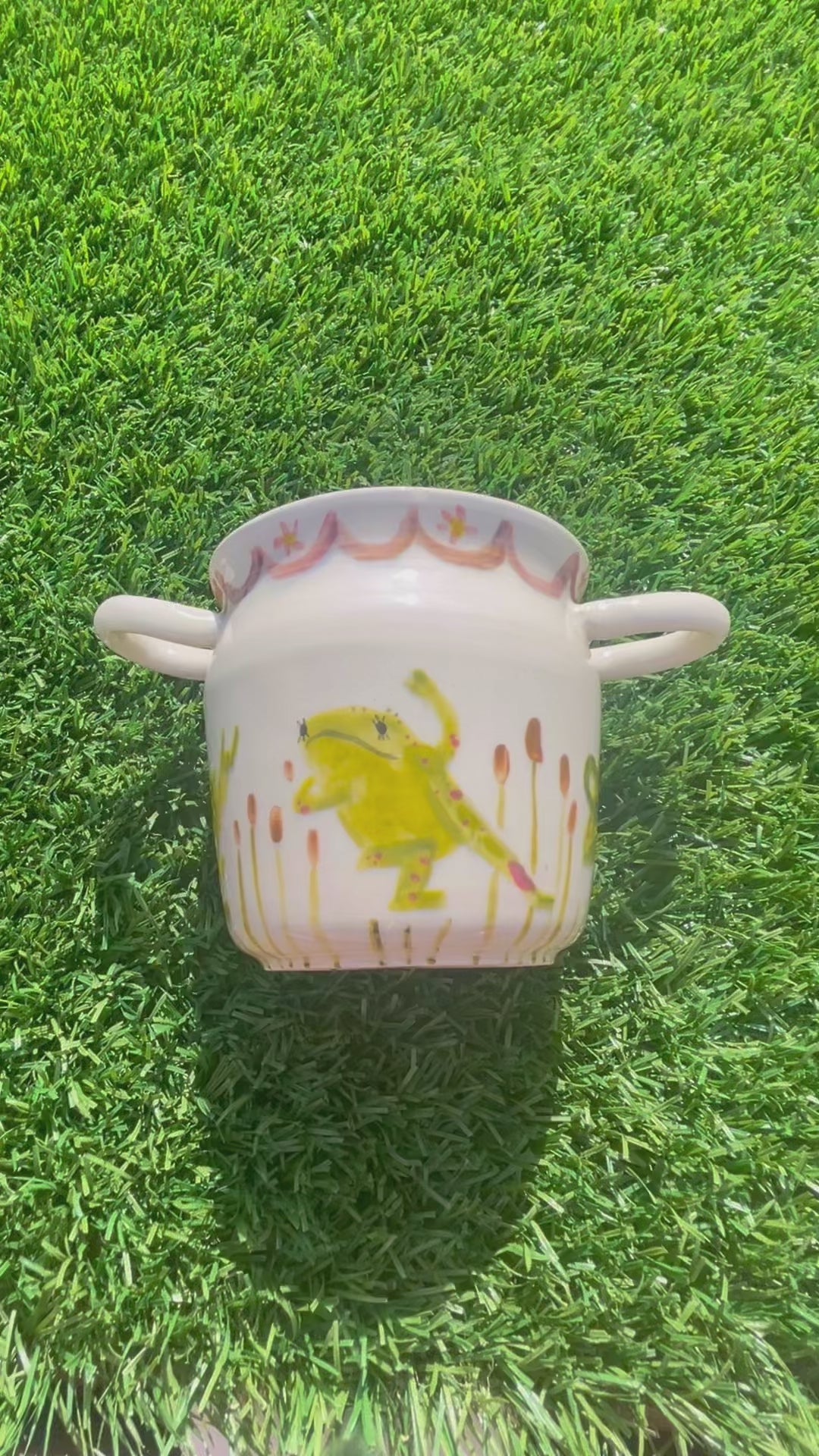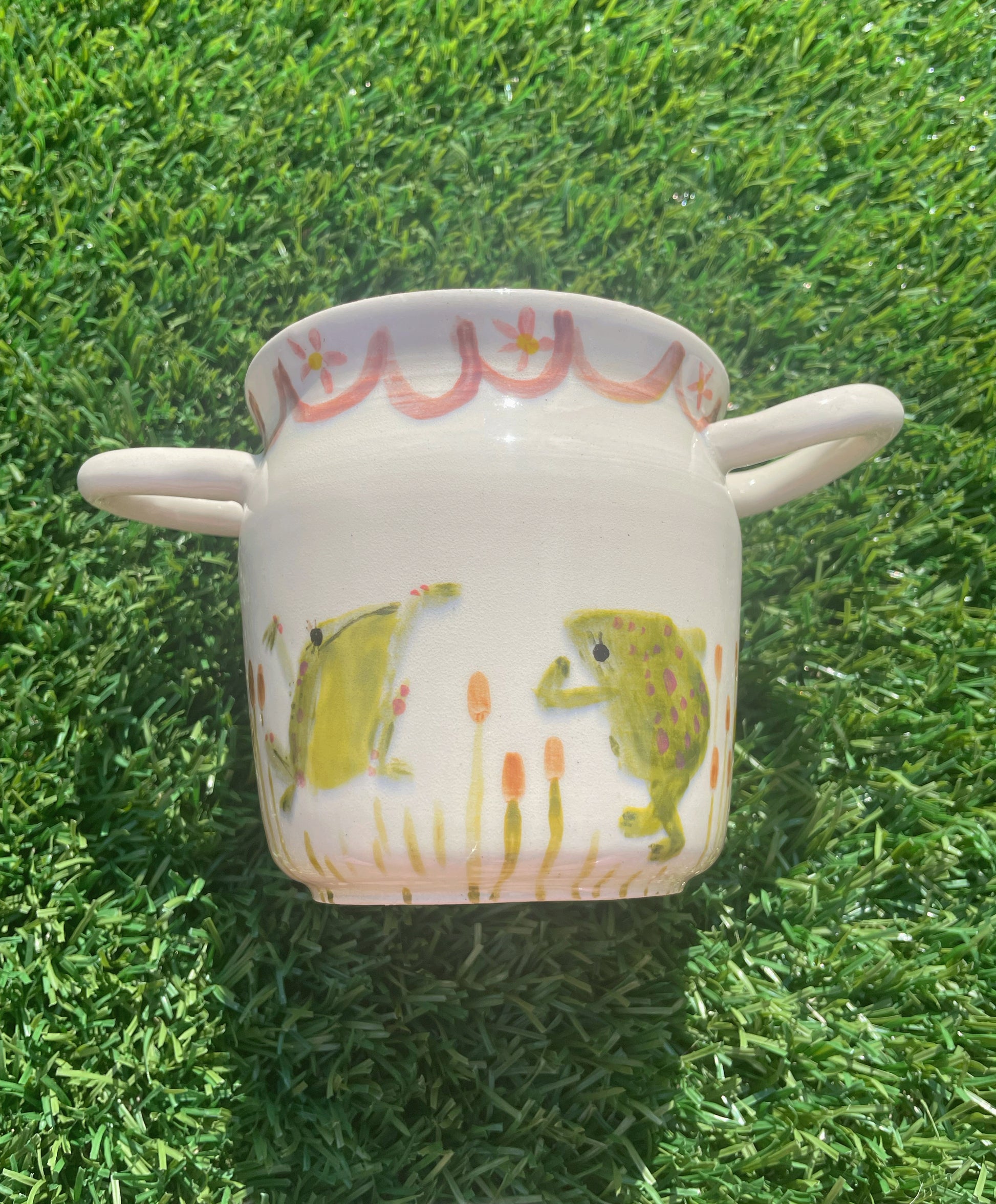 White porcelain Glaze Days small vase handpainted by mexican artist Brenda Torres. Little frog hopping around looking!