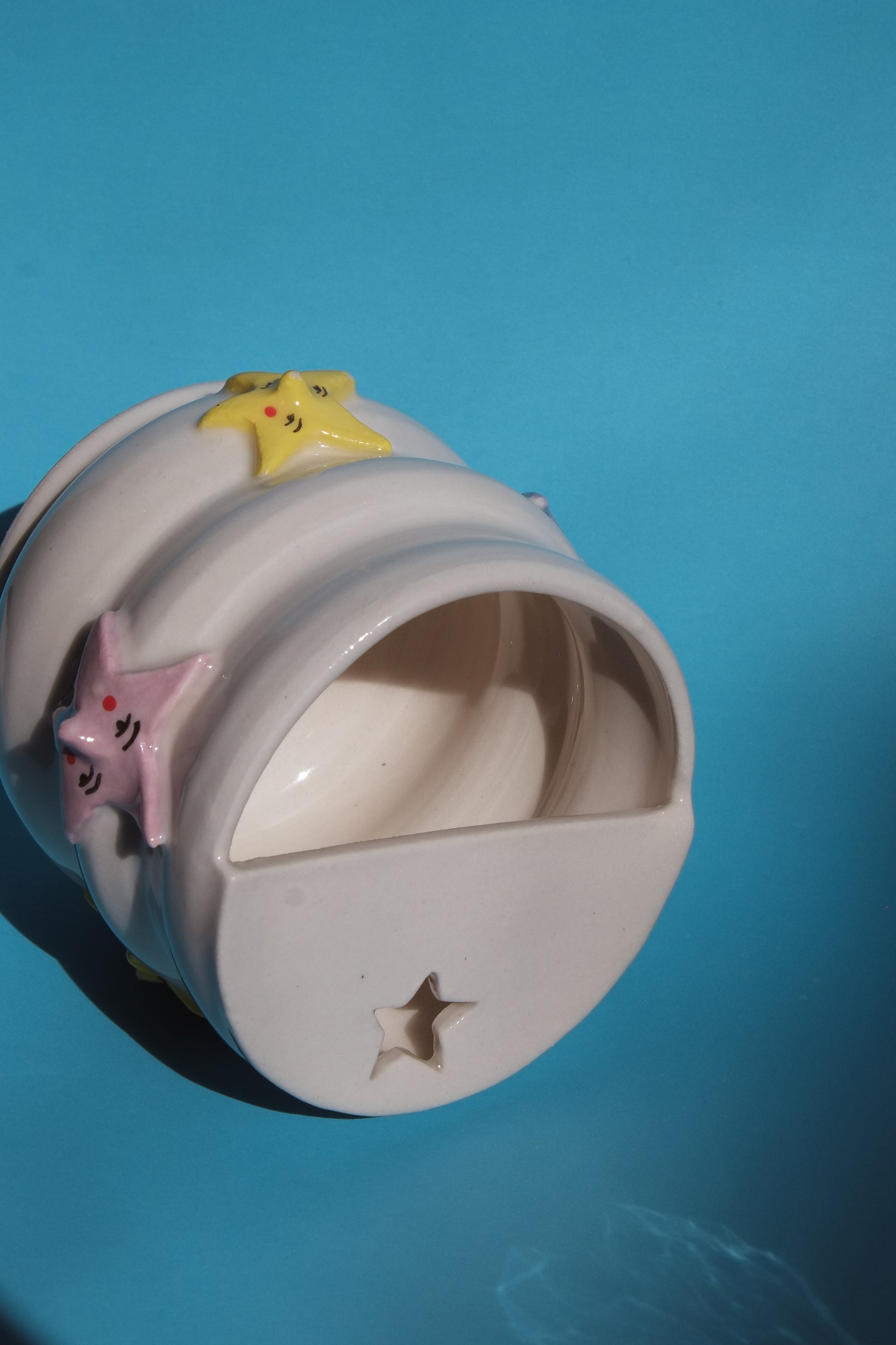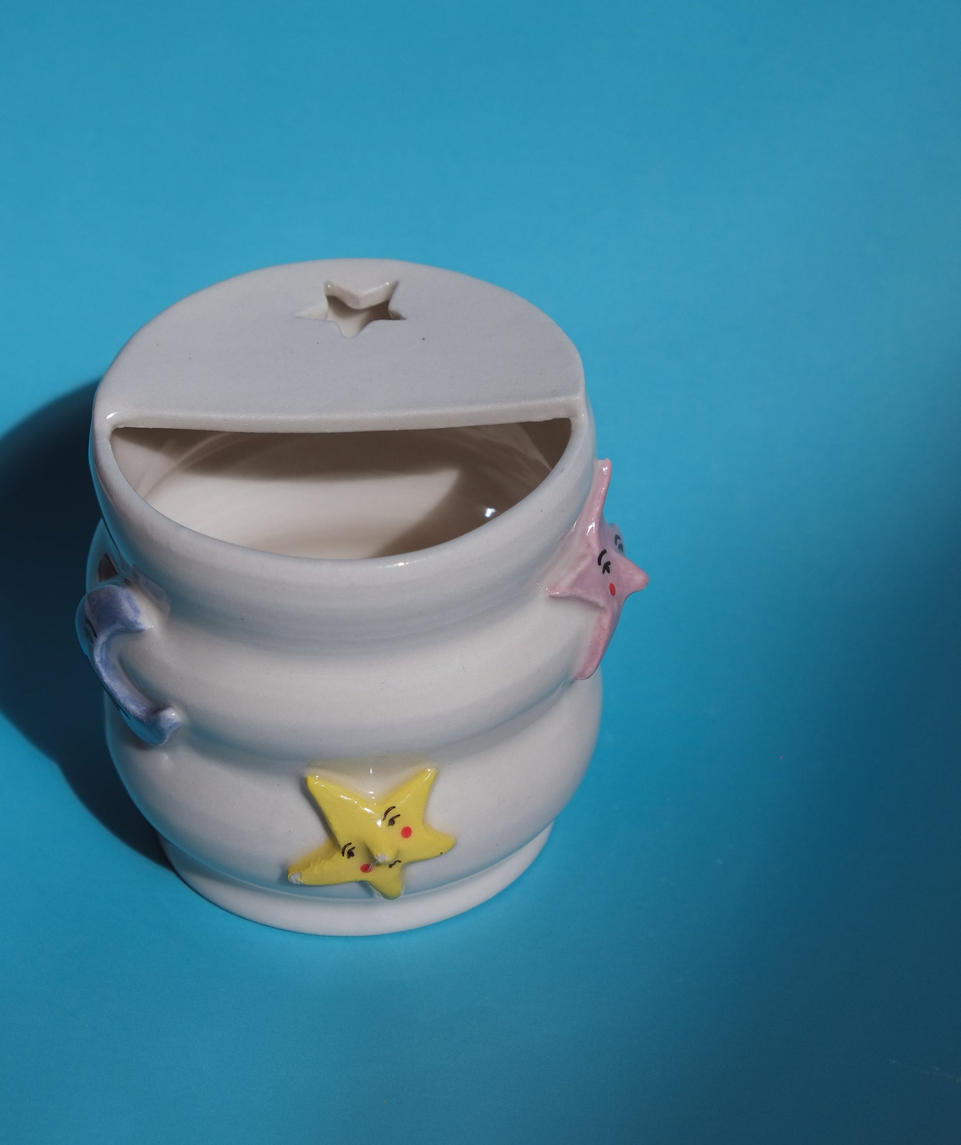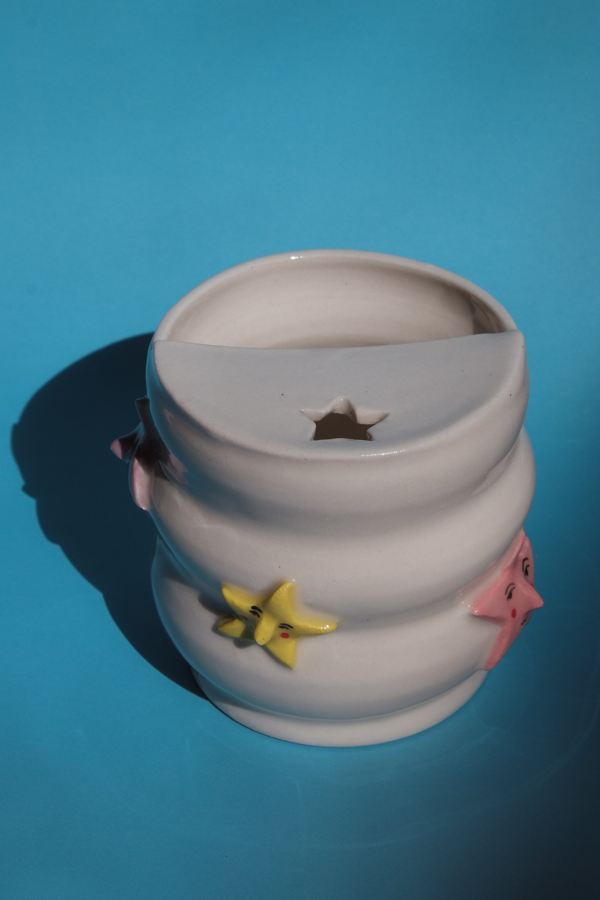 Wheel thrown porcelain travel cup with hand sculpted stars and moons with painted faces. Comes with a glass straw that fits perfectly with the cup!