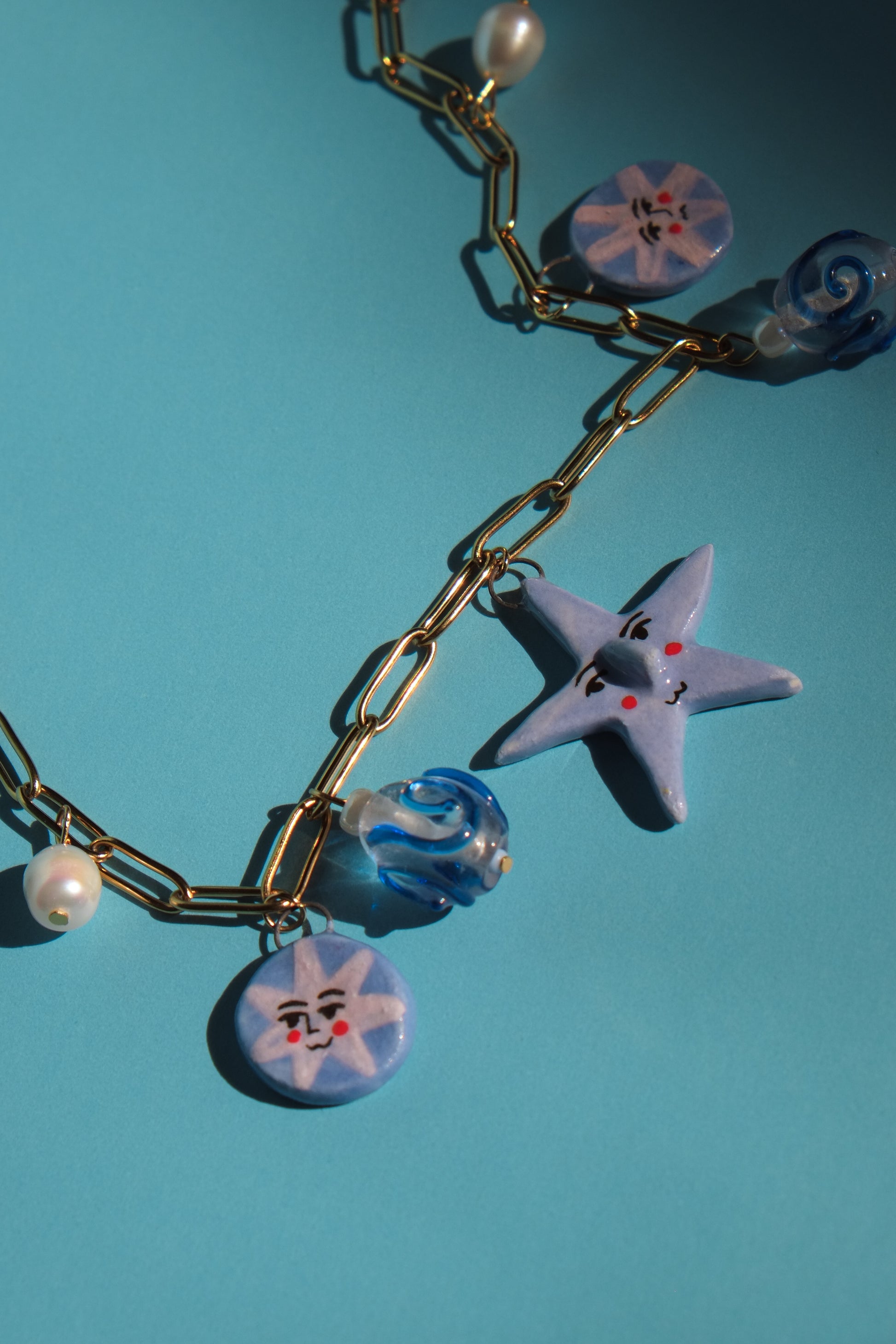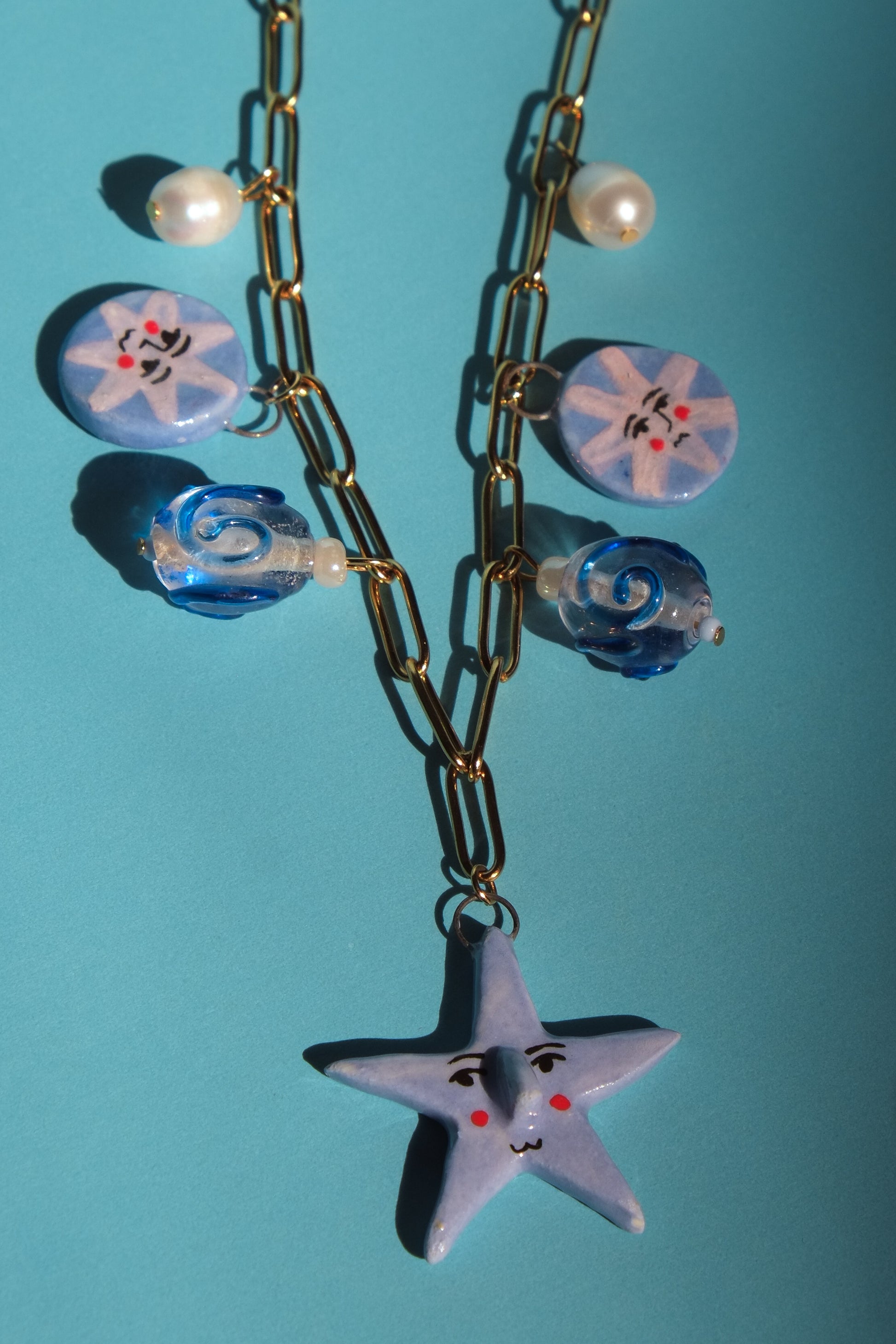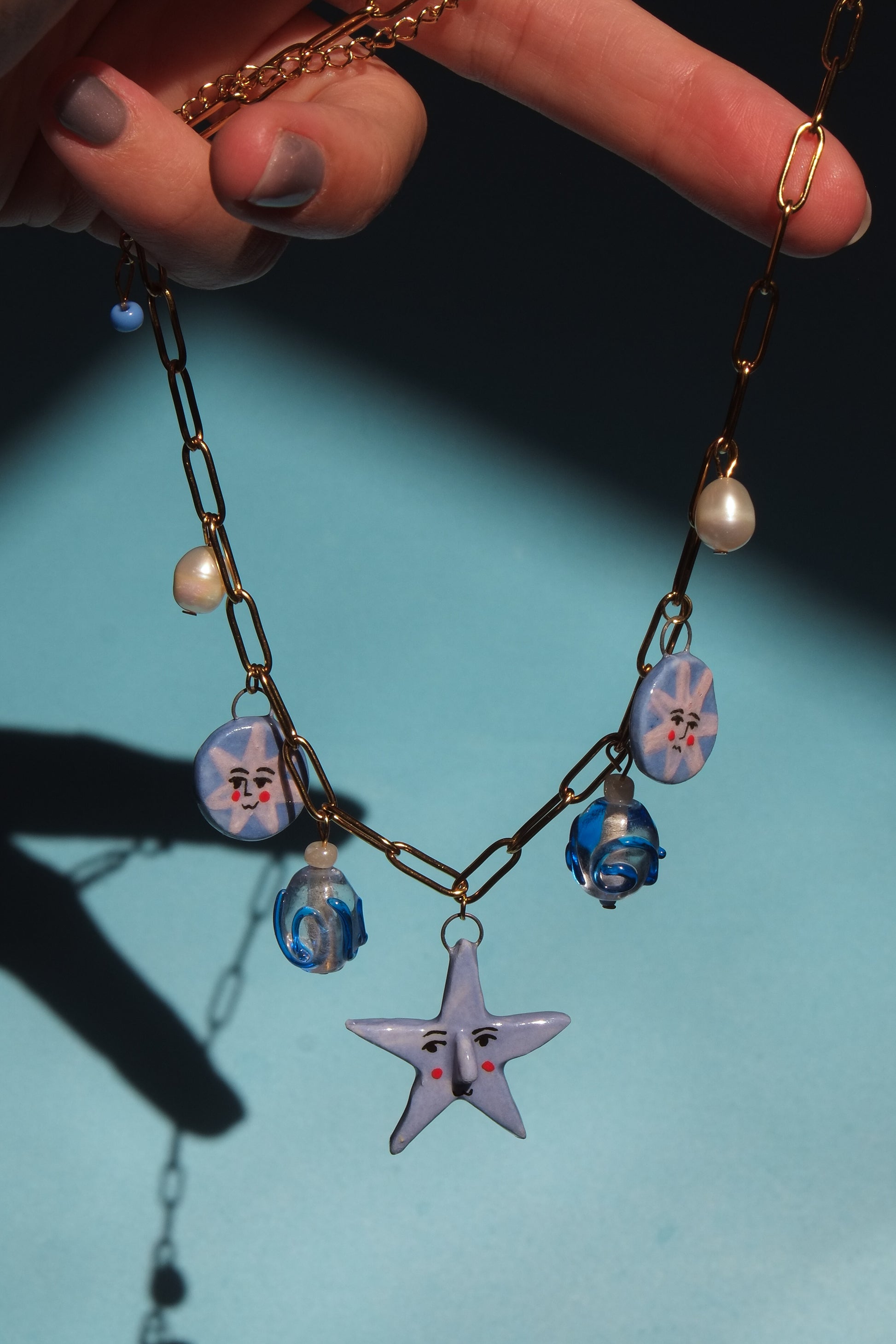 Gold-plated stainless steel chain with handpainted porcelain charms & glass beads.