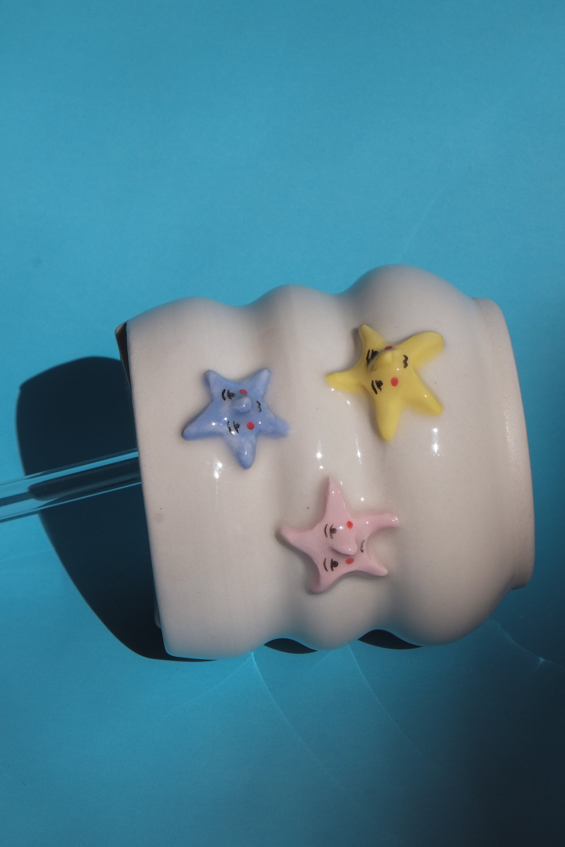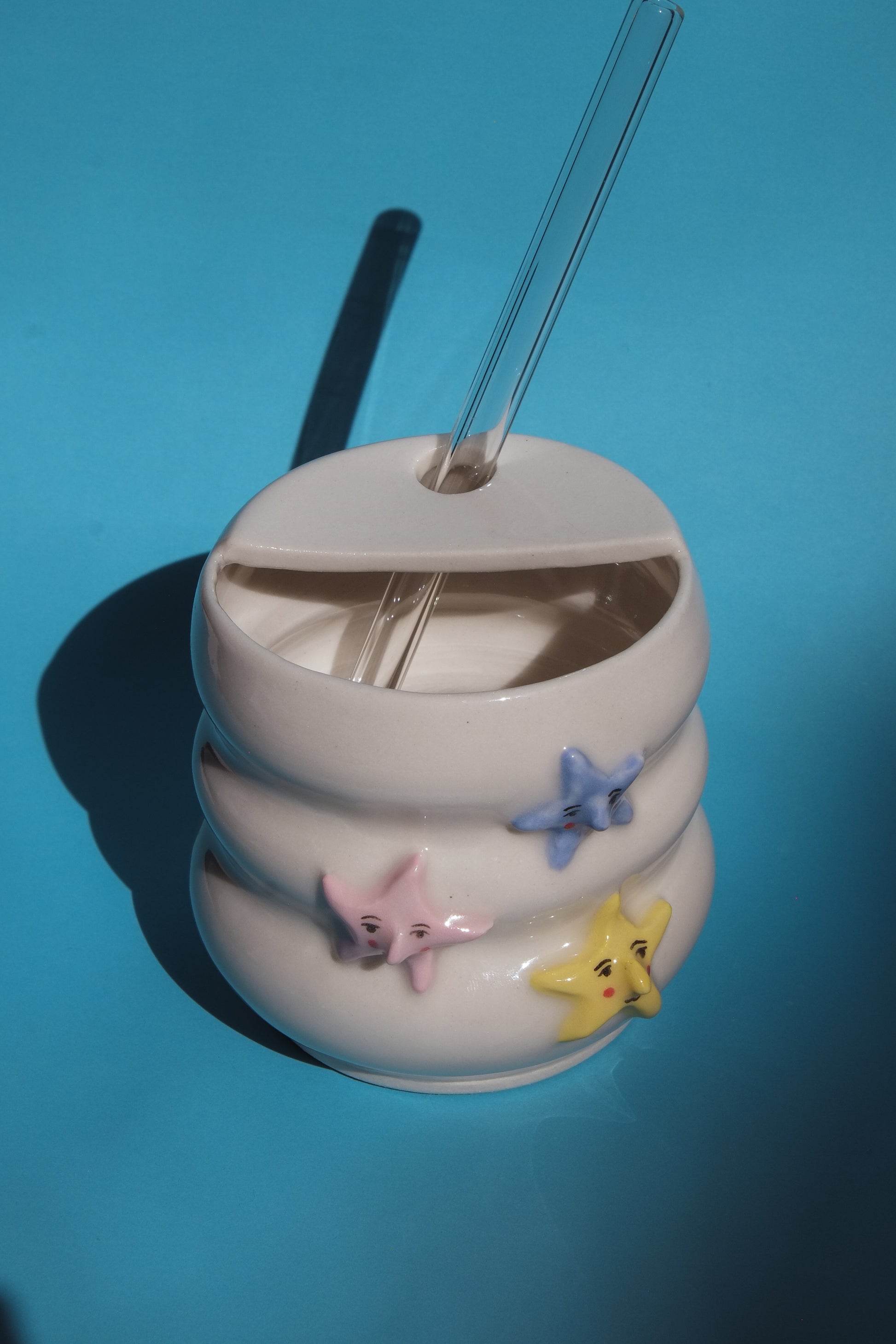 Wheel thrown porcelain travel cup with hand sculpted stars and painted faces. Comes with a glass straw that fits perfectly with the cup!