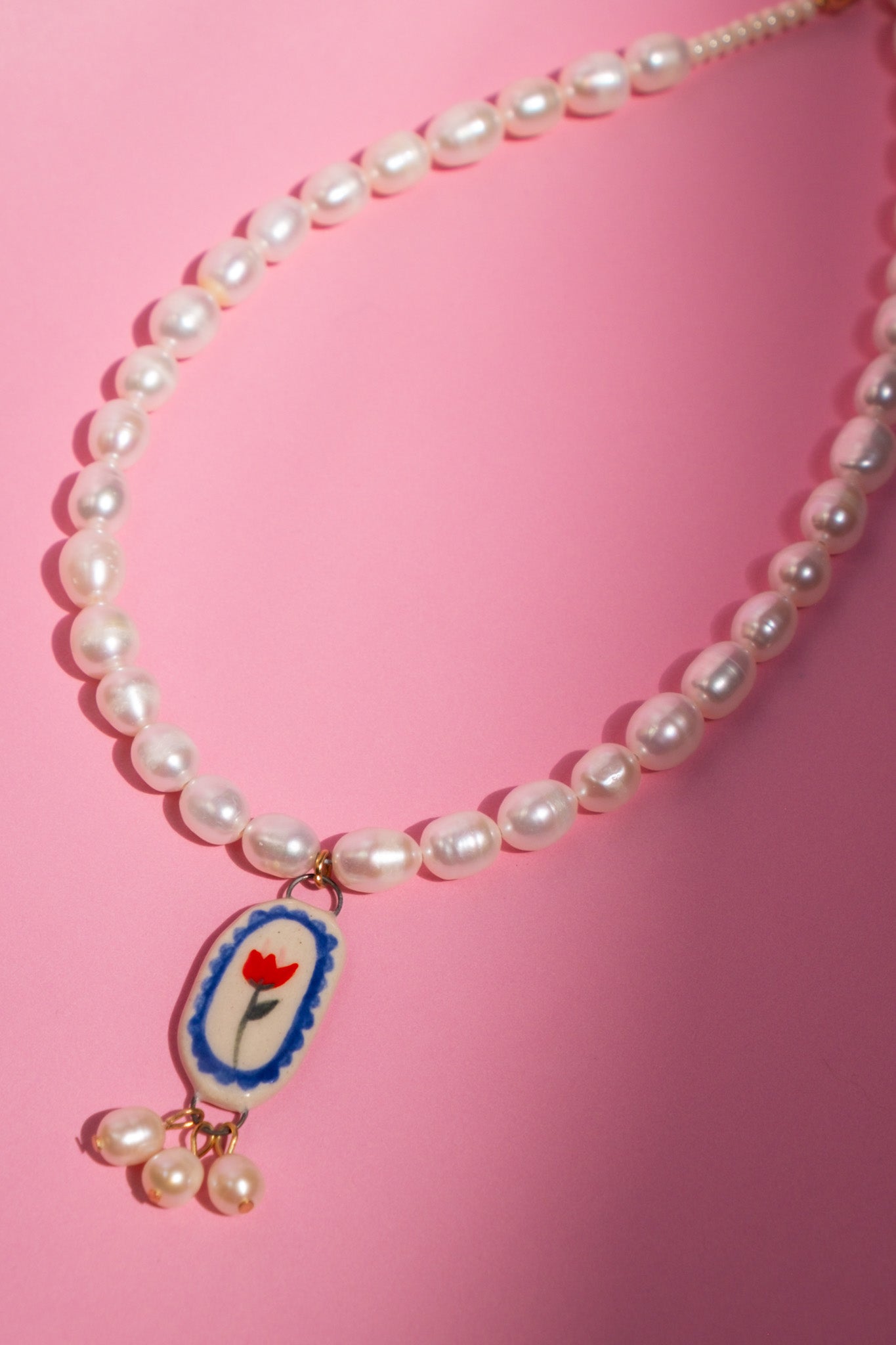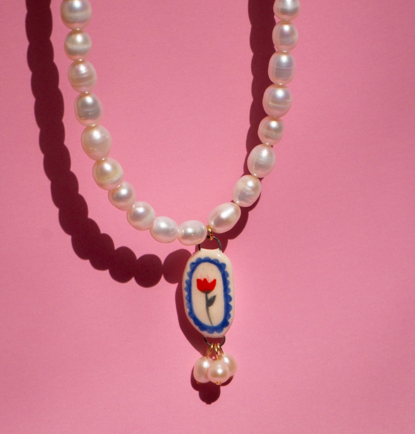 Stainless steel chain with handpainted porcelain charms and freshwater pearls.