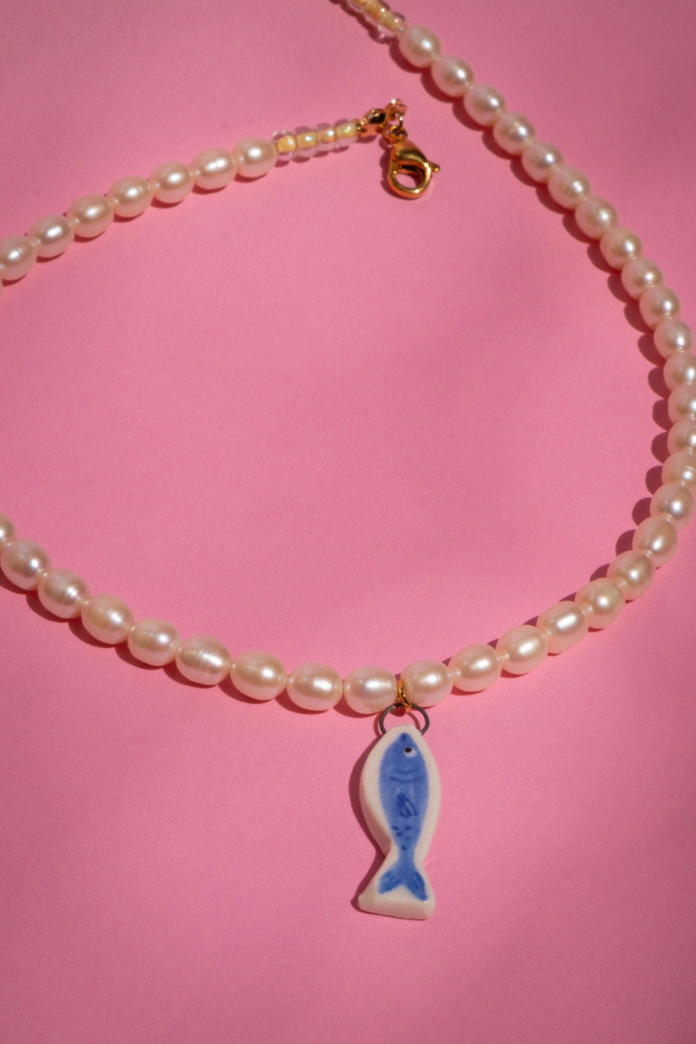 Stainless steel chain with handpainted porcelain charms and freshwater pearls.