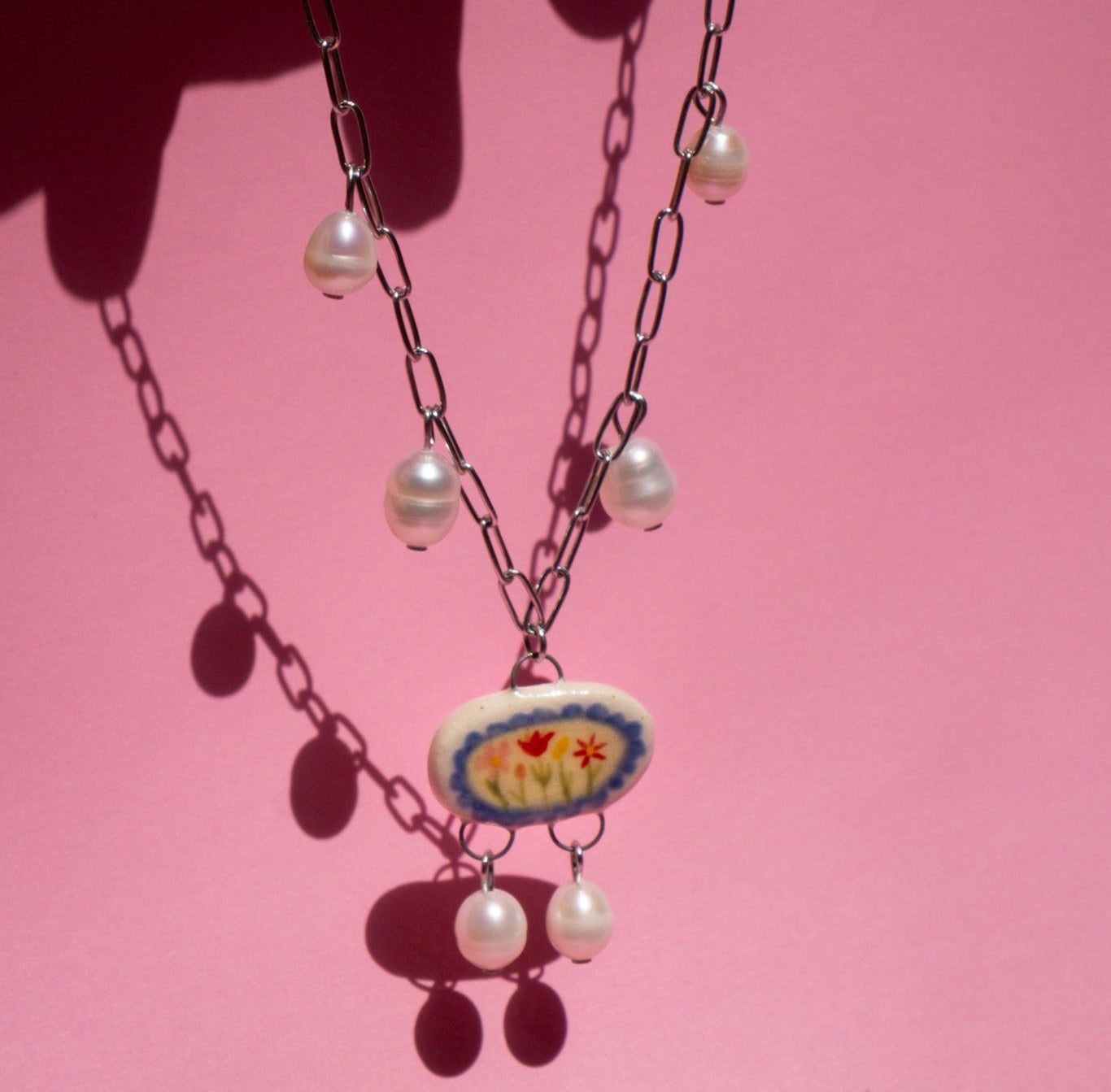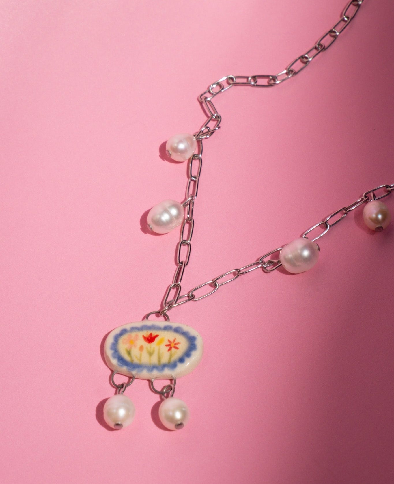 Stainless steel chain with handpainted porcelain charms and freshwater pearls.