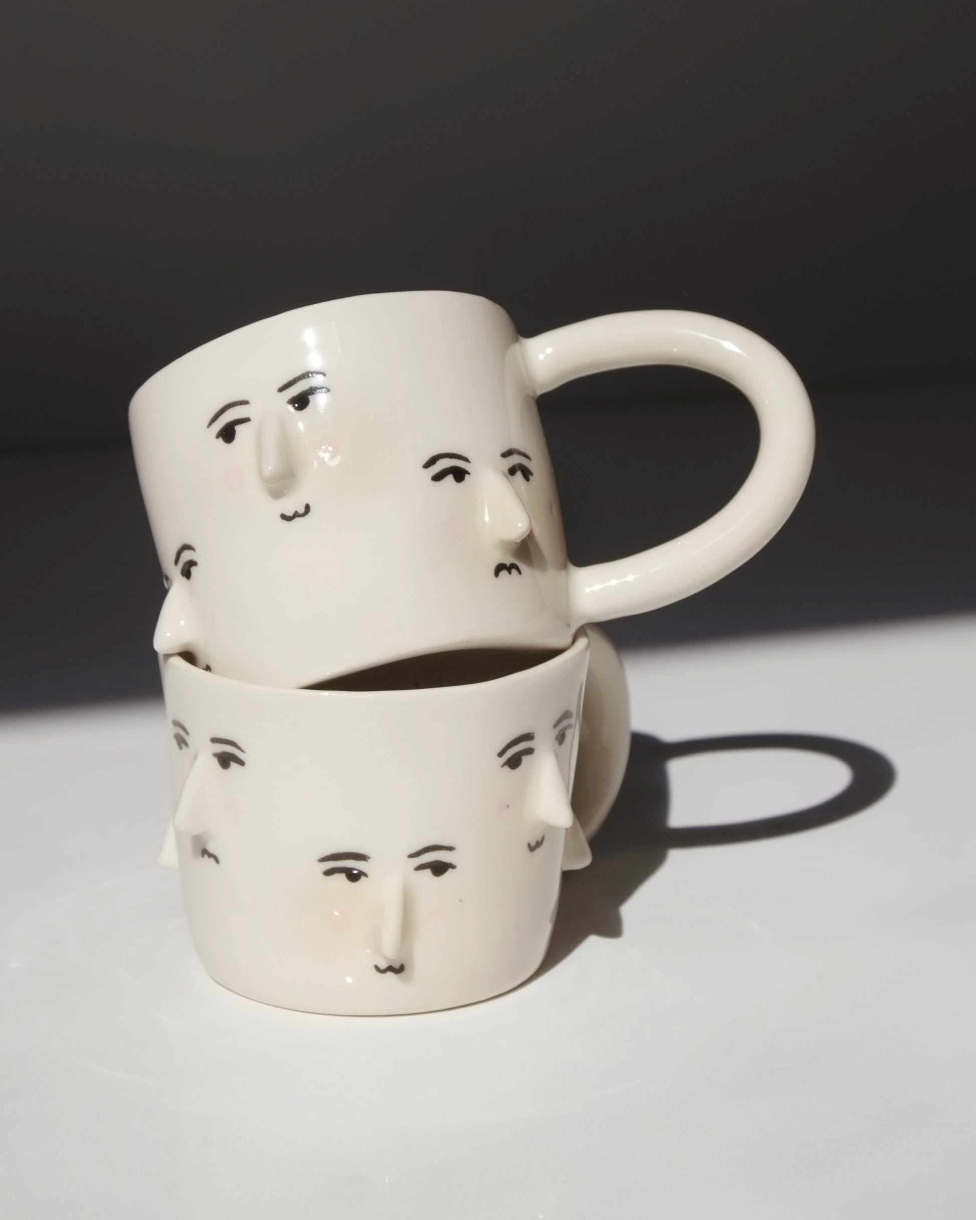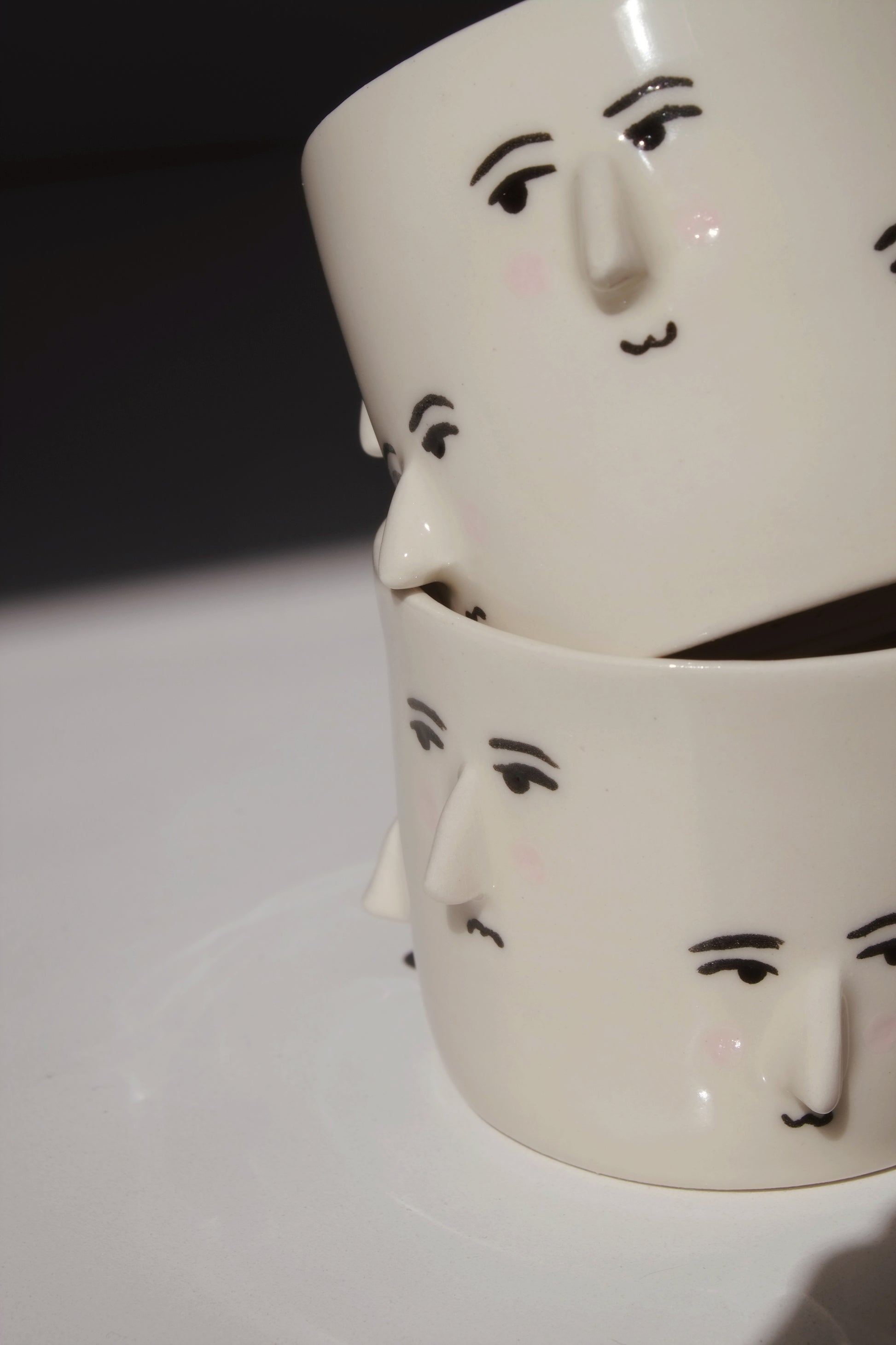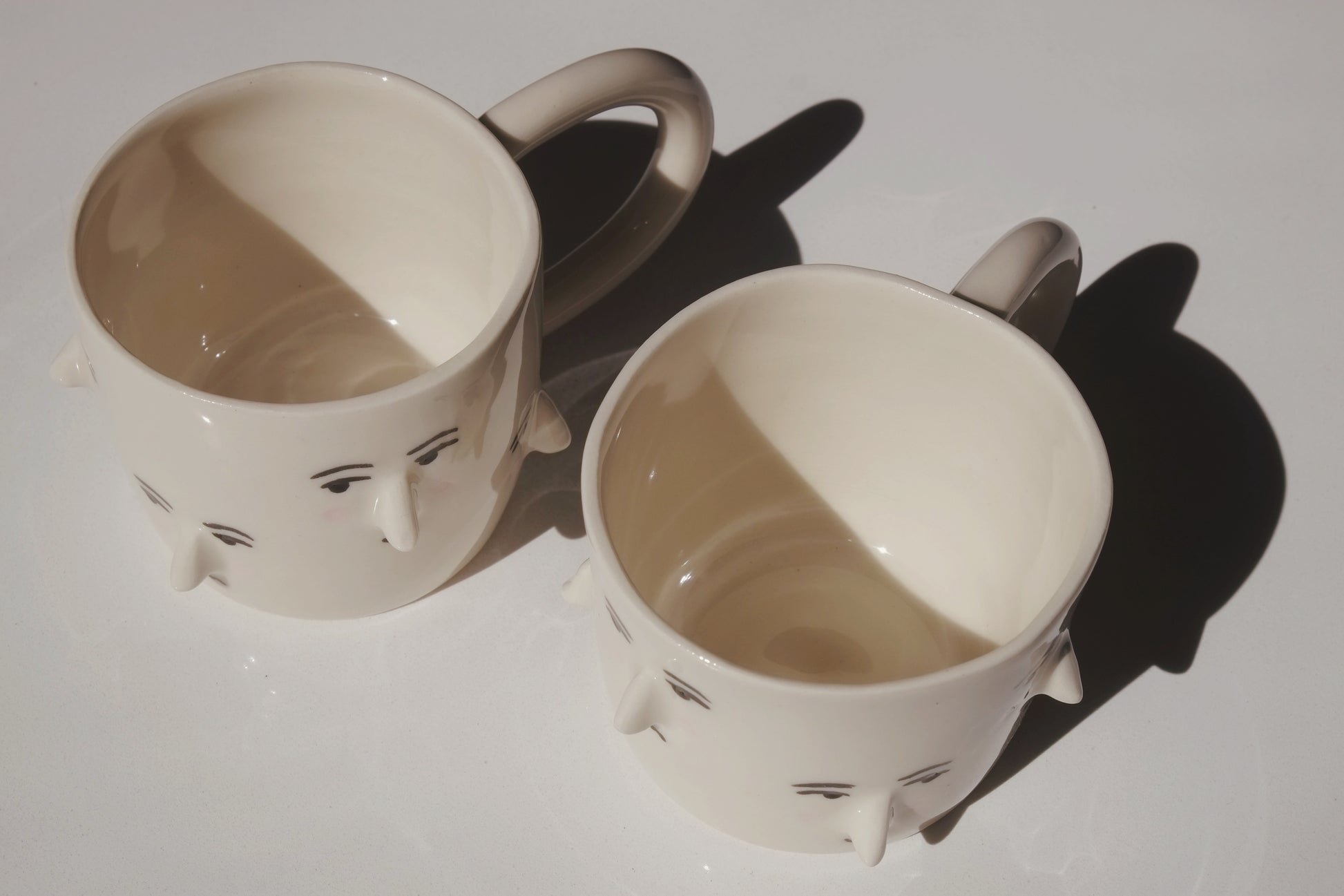 Wheel thrown small mugs with hand sculped noses and handpainted faces.