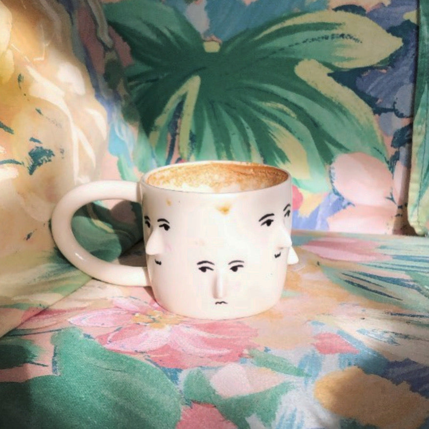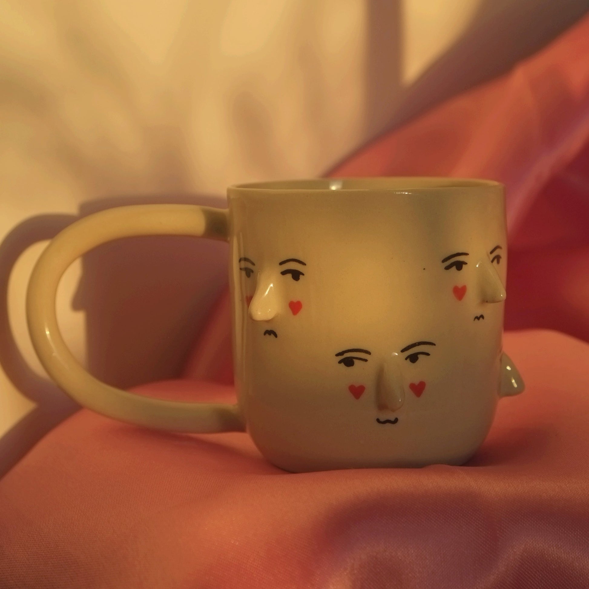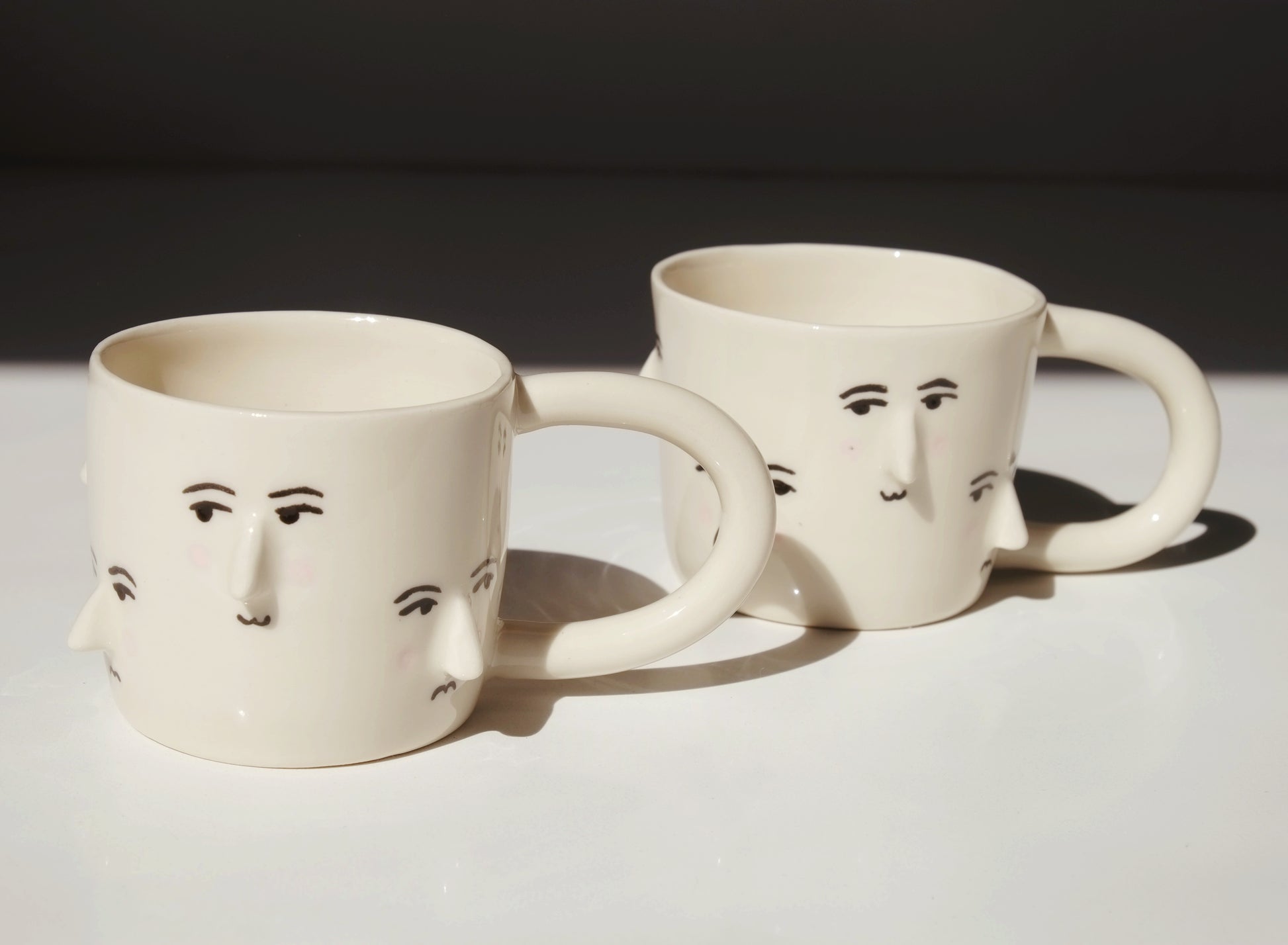 Wheel thrown small mugs with hand sculped noses and handpainted faces.