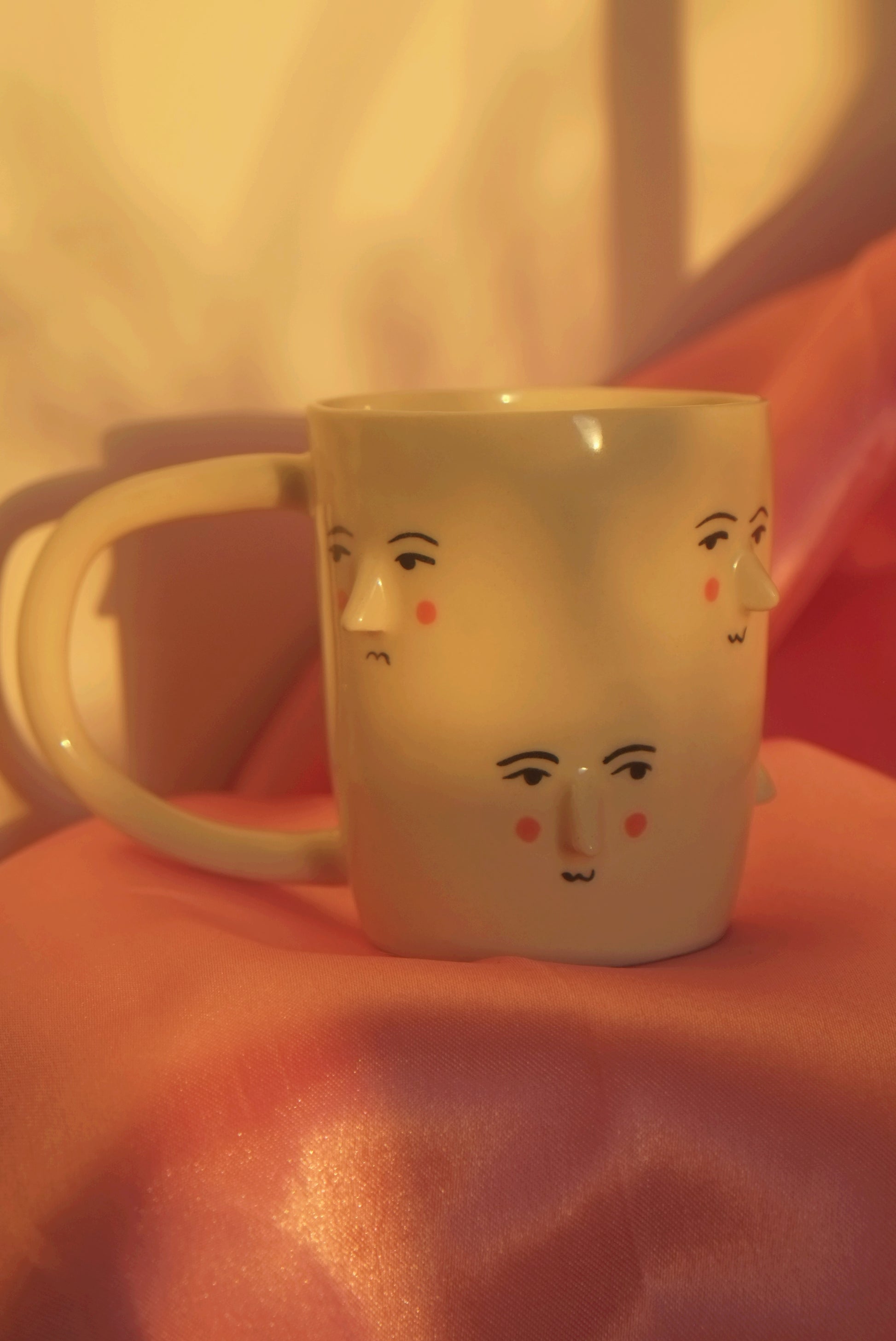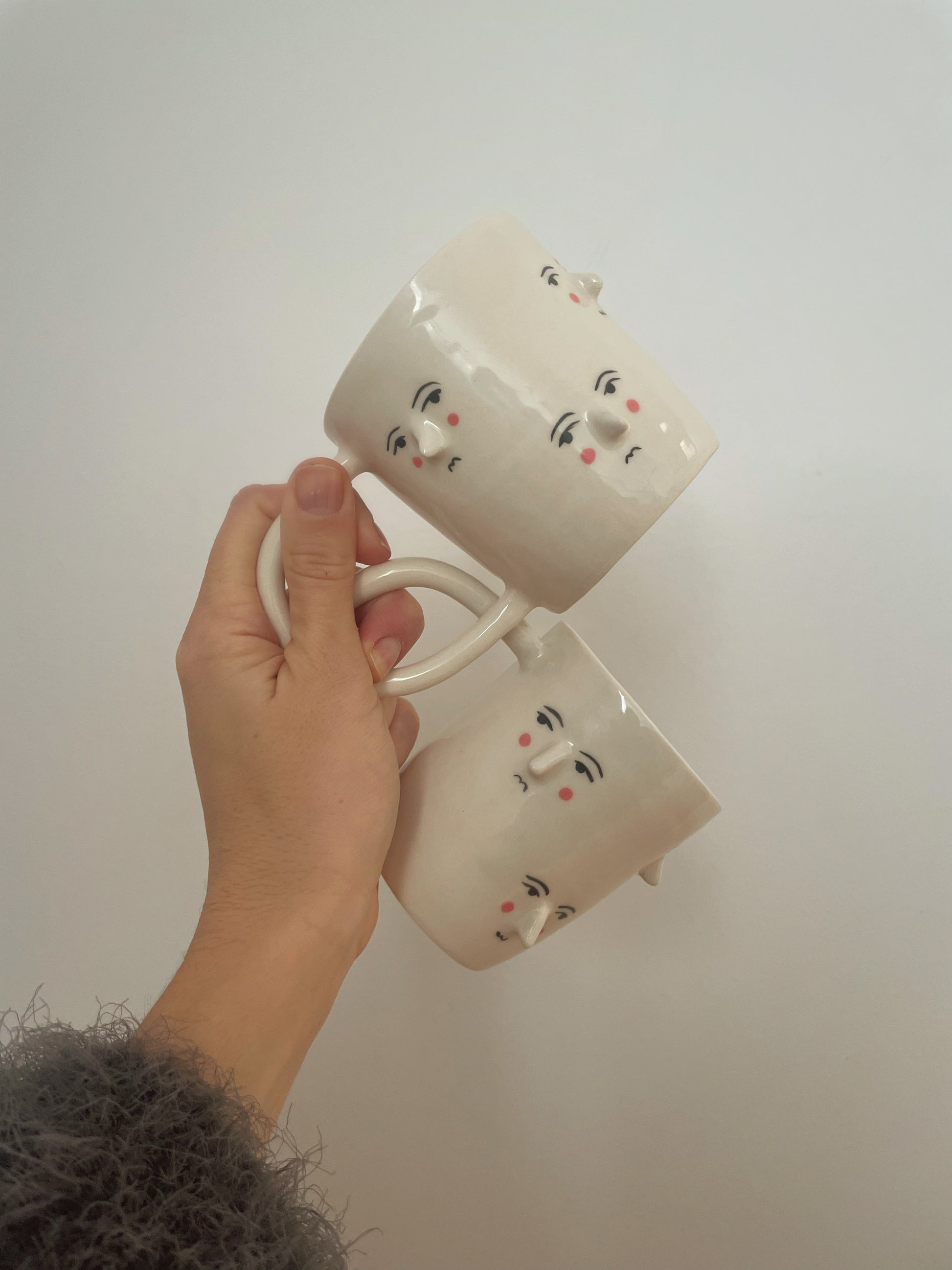 Wheel thrown small mugs with hand sculped noses and handpainted faces.