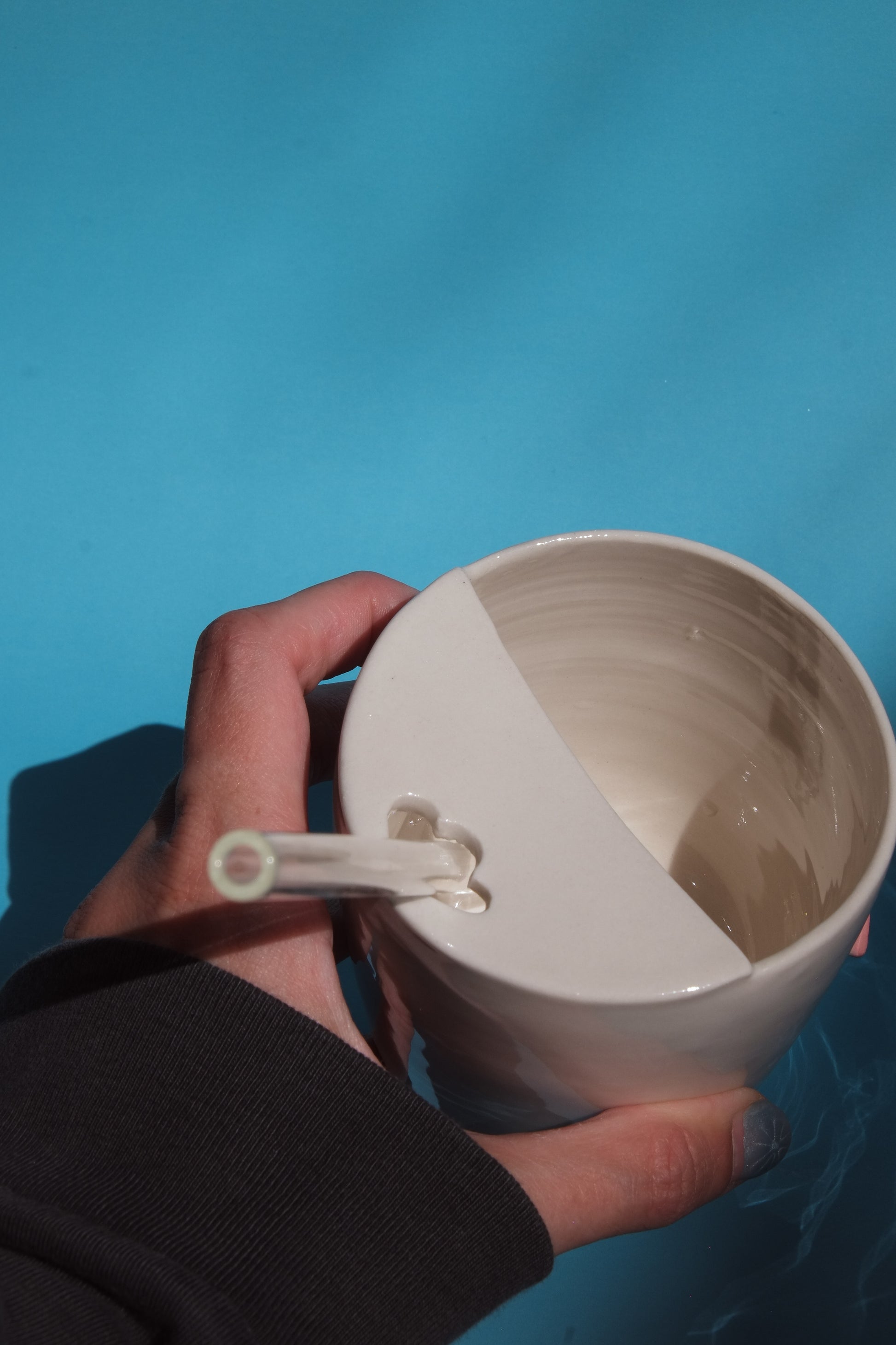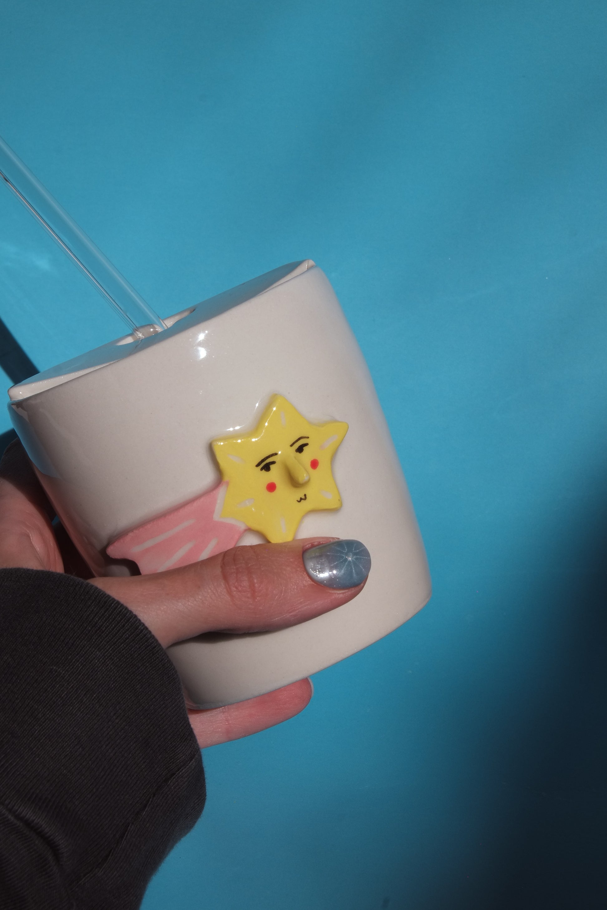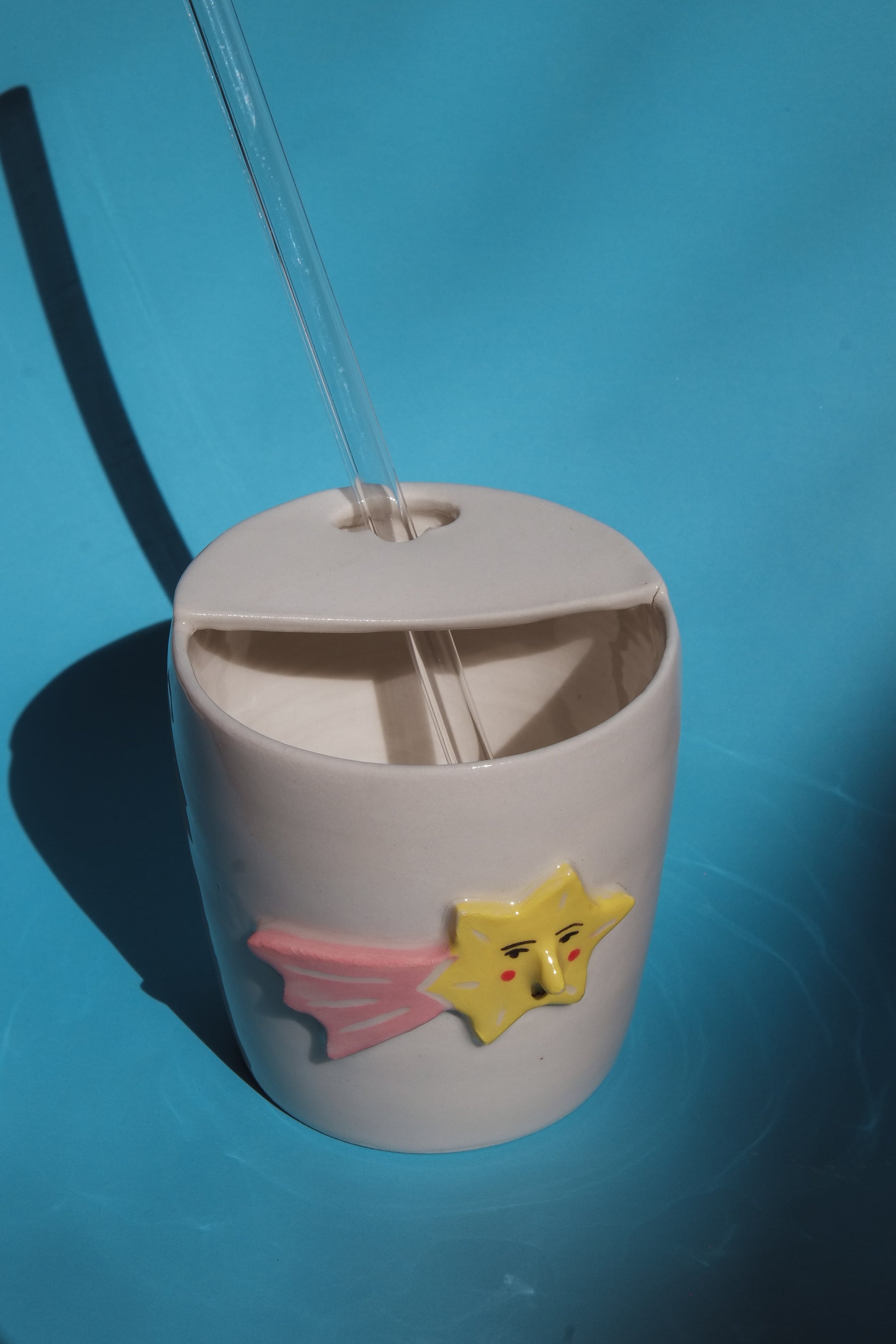 Wheel thrown porcelain travel cup with hand sculpted stars and moons with painted faces. Comes with a glass straw that fits perfectly with the cup!